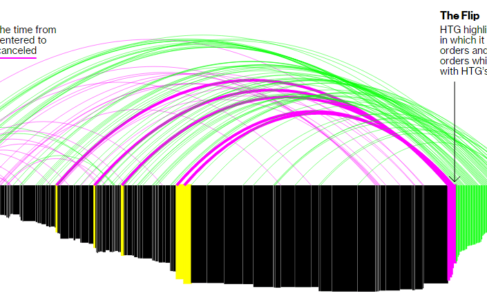 I came across the article “How to Catch a Spoofer” from Bloomberg, by Matthew Leising, Mira Rojanasakul and Adam Pearce. The article gives a fascinating view into the trading activity on the Chicago futures exchange, and how to identify “spoofing” within trading activity. The visualizations take a combination of a difficult concept and large volume of data, and extract genuine, novel insights.