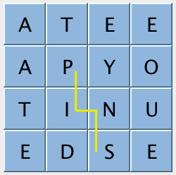 Princeton’s Algorithms II course includes an assignment on finding Boggle words. Briefly, Boggle is a game where you have a two dimensional grid of random letters and players try to find as many real words as they can from the board by stringing together neighbouring letters.